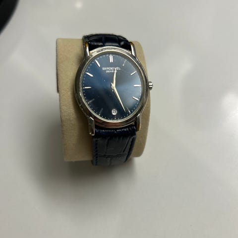 Raymond Weil miesten rannekello, jossa on pyöreä teräskuori ja musta kellotaulu. Kellossa on kronografitoiminnot, useita apunäyttöjä sekä päivämäärä- ja viikonpäivänäyttö. Sekuntiviisari ja osa merkinnöistä ovat keltaiset, mikä parantaa luettavuutta. Takakansi on läpinäkyvä, jolloin koneisto näkyy. Ranneke on ruskeaa nahkaa perinteisellä solkikiinnityksellä. Kello sopii miehille arki- ja pukukäyttöön.