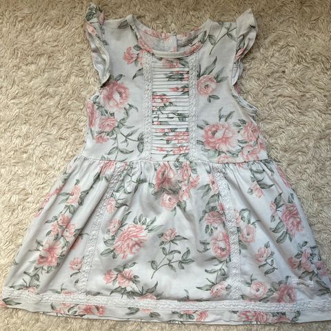 Myydään käytettynä ostetut Newbien valkoinen body ja kukalliset housut. Housuissa takana rypytykset.