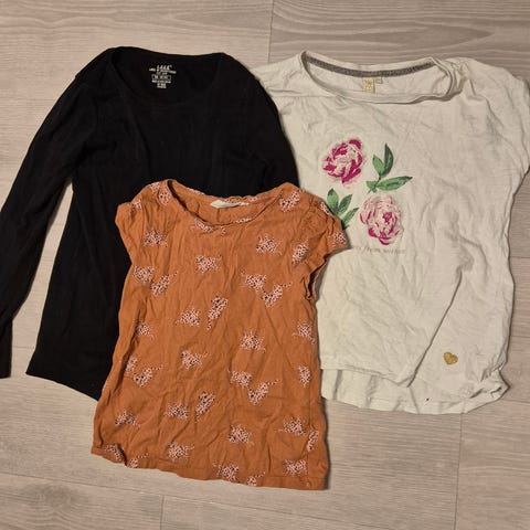 Kahdet verkkarit, jumpsuit ja T-paita sekä siistit boxerit. Kokolapuissa koot 134/140-152, mutta olleet käytössä koon 134/140 aikana. Käytönjälkiä, mutta ei reikiä. Rymykäyttöön ainakin. Alushousut voin napata pois, jos niitä ei halua mukaan.
