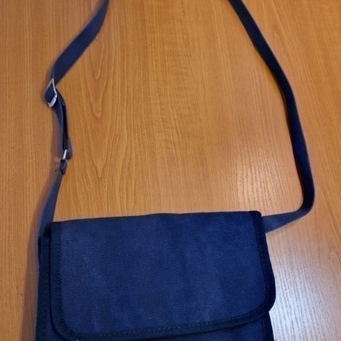 Vanha tummansininen Marimekon käsilaukku. Hyväkuntoinen. Laukun sisällä yksi iso tasku ja toinen pienempi "päällistasku". Olkahihnan pituus n.90 cm,laukun korkeus 19cm,leveys 22cm.