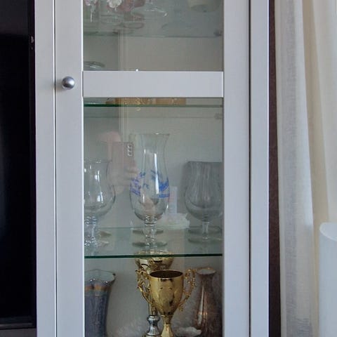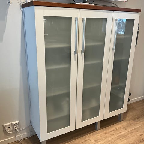 2 kpl Ikean lasivitriiniä. 2 kpl valoja/kaappi asennettu tarrakiinnityksellä. Neljällä valolla yhteinen katkaisija. Siisti ja hyväkuntoinen. Korkeus 162 cm, syvyys 37 cm, yhden kaapin leveys 43 cm.