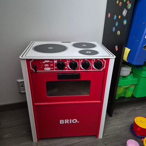 Aikaa ja monta leikkiä nähnyt mutta toimiva Bimba merkkinen pattereilla toimiva leikkiuuni/liesi.
