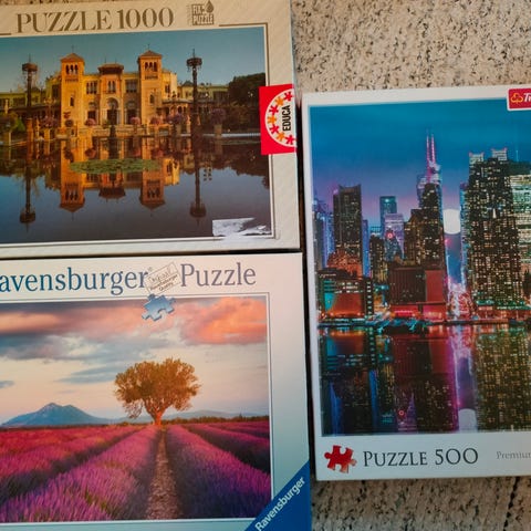 Erä erilaisia palapelejä. Mukana muun muassa Citymarketin 54 palan palapeli (koko 29,7 x 42 cm) vihreistä eläinhahmoista, 1000 palan Finland-aiheinen palapeli, 100 palan koira- ja kissakuvallinen palapeli (koko 42 x 29,7 cm), Ravensburger 500 palan palapeli kissakuvalla sekä 500 palan Kissanpäivät-palapeli oranssista kissasta. Palapelit sopivat eri ikäisille kokoajille ja tarjoavat eritasoisia haasteita 54 palasta 1000 palaan.