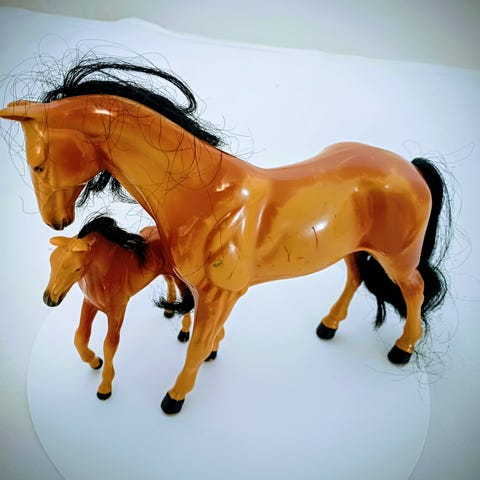 Pieni, keräiltävä muovihevonen, jolla on harja ja häntä.