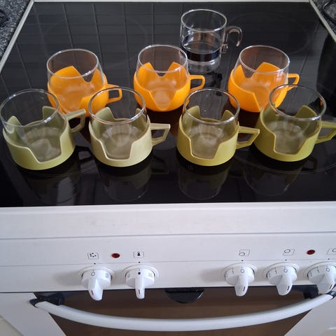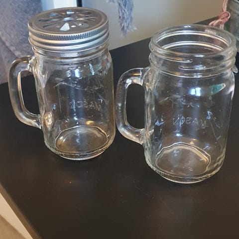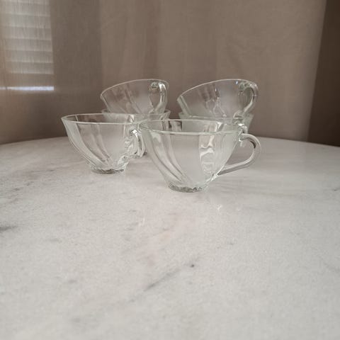 Lasimukit kahvalla. Kirkkaasta lasista valmistetut mukit, joissa on kohokuvioitu pinta ja pyöreä korva. Sopivat esimerkiksi kuumille ja kylmille juomille arki- ja kattauksiin. Myydään kuvien mukaisena settinä. 2 kpl. Yhteensä 10 eur.
