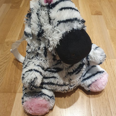 Rumpali reppu Vanha. Silmissä kulumaa. Sisäpuolelle kirjoitettu nimi joka näkyy himmeesti.