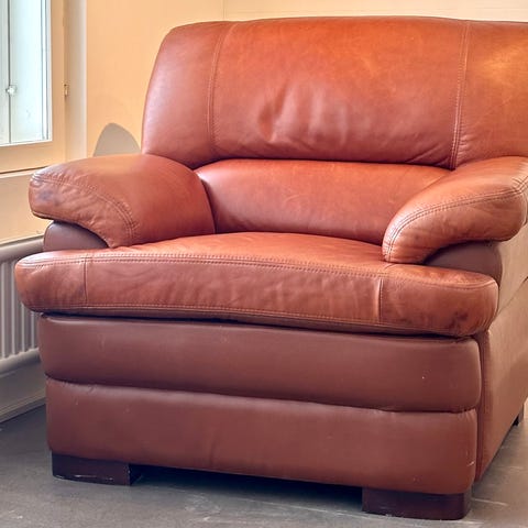 Aitoa nahkaa oleva muhkea nojatuoli. Tuolissa keinuva ja pyörivä ominaisuus.