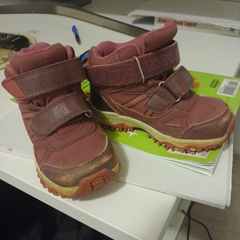 Erittäin hyväkuntoiset vaaleanpunaiset tarralenkkarit. Pohjallinen ei lähde irti, joten sm ei voi mitata. Ciraf-merkkiset. Toisen kengän etuosa saanut pientä osumaa (näkyy kuvissa) ja valkoiset osat toki ei ole enää täysin valkoiset.