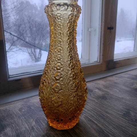 Hyväkuntoinen,ehjä ja siisti maljakko. Yksi osio lohenpunainen. Pohjassa merkintä 98 ja jokin muu,josta en saa kunnolla selvää. Korkeus 16cm.