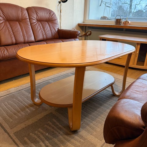 Jyskin sohvapöytä, kannessa jonkin verran viivamaisia kohoumia. Muuten ehjä. Nouto Myyrmäestä.
