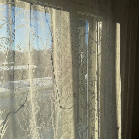 Myydään valko-harmaa sävyiset ihanat maalaisromanttiset sivuverhot.Merkki Jotex
