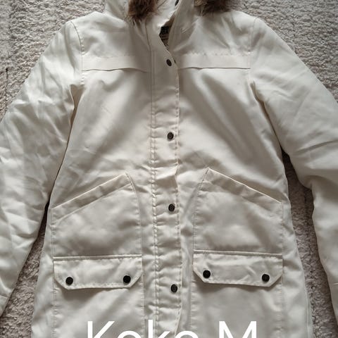Naisten valkoinen talvitakki koossa M. Takissa on hupun reunassa tekoturkisreunus puuttuu nappi ja vyötäröllä kiristysnyöri istuvuuden säätöön. Edessä on vetoketju ja painonappikiinnitys sekä läpälliset taskut. Sopii koviin pakkasin