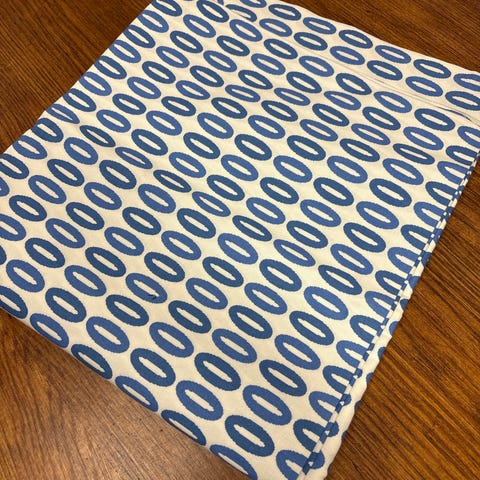 Marimekko Kaunis Kauris -metrikangas n. 140 x 114 cm, jossa pääväreinä tummansininen, pinkki, punainen ja sininen. Ei ommeltu. Ei pesty ja kauriin kohdalta hieman sininen väri levinnyt kauriin päälle. En koittanut poistaa.