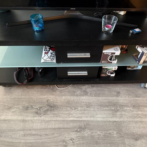 IKEA tv-taso. Valkoinen runko ja avohyllyt, tumma/musta kansitaso. Sopii television ja viihdelaitteiden sijoittamiseen sekä säilytykseen olohuoneessa tai muussa asuintilassa.