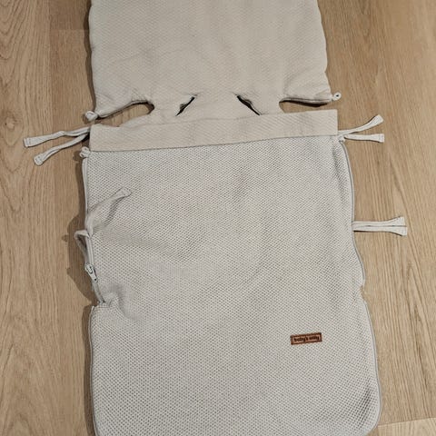 Lämmin, siistikuntoinen musta lämpöpussi rattaisiin. Takana reiät turvavöitä varten. Yläosan saa kiristettyä kuminauhalla pussiksi.