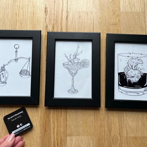 Sisustustauluja mustilla kehyksillä.