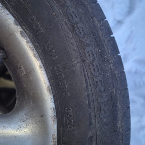 Tästä vannesarja. Yks vanne ajettu rotvalliin. Kumit hyvät. Rotvalliin ajetussa kyljessä vekki. Nopeimmalle halvalla!