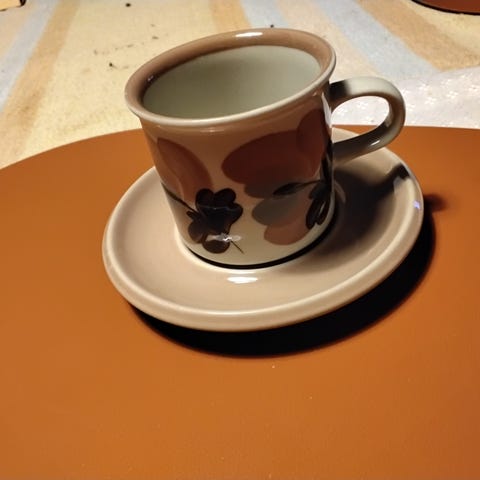 Arabia 6 kuppia ja aluslautaset. Valkoinen posliininen kahvikuppi ja siihen kuuluva aluslautanen, joissa molemmissa on samanlainen vaalea, lehtimäinen koristekuvio. Sopii esimerkiksi kahvin tai teen tarjoiluun arjessa ja kattauksissa.