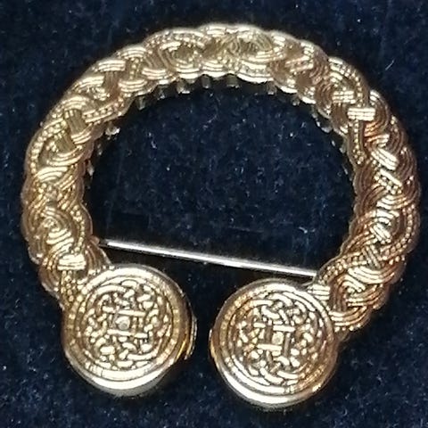 kullattu, keskellä tummanharmaa hematiittikivi, reunoilla ja silminä kirkkaita synteettisiä korukiviä, kunto käyttämätön, kuin uusi, koko 4 cm x 3,5 cm, h. 20,-