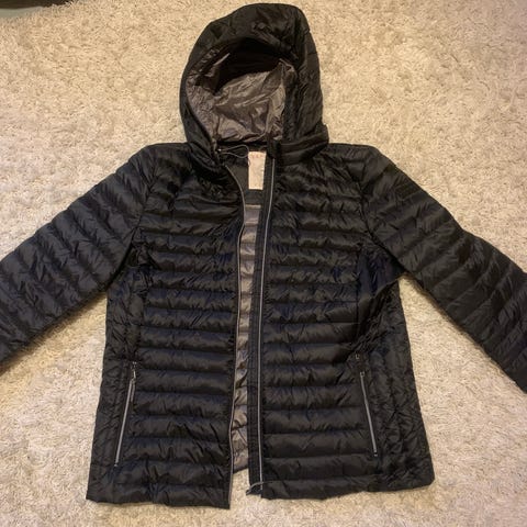 Reset naisten toppatakki, koko L. Väri beige. Kevyesti topattu untuvatakki, jossa vaakatikkaus. Polveen saakka-malli, jossa kiinteä huppu ja täyspitkä vetoketju edessä. Kaksi vetoketjullista sivutaskua.