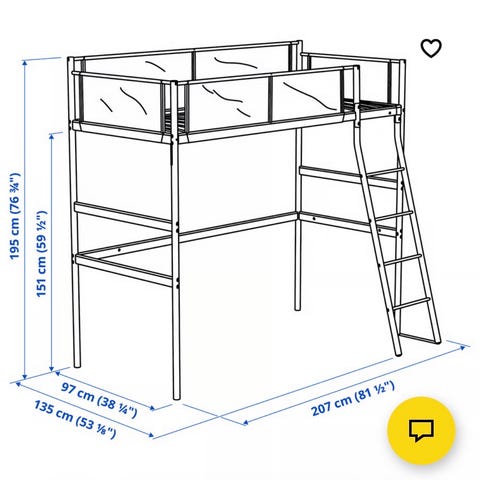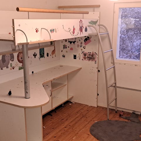 Ikean parvisänky ja patja. Peruskoko 80x200cm. Sängyn laidan yläreuna n. 180cm korkeudella.