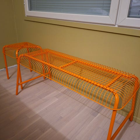 N. 88 cm leveä penkki Jyskistä. Päällä alunperin olleet napit lähteneet kankaasta irti, muutoin moitteeton kunto.