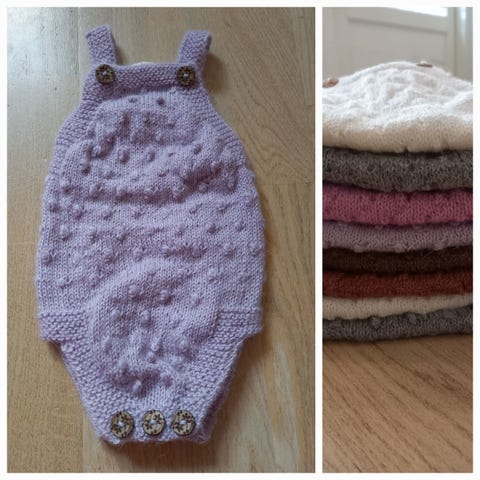 Käsin 100% alpakanvillalangasta kudottu romper/villabody kokoa 56(-62). Rompereita saa kahdenlaisella neuloksella, pisineulos ja popcorn-neulos. Pitsiromper on 28€ ja popcorn-romper 30€.