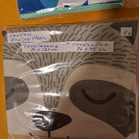 Ensipeitteen pussilakana + tyynyliina, pinnasänky kokoa.