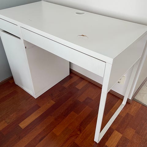 lasten kampauspöytä peilillä ja jakkaralla. Valkoinen puinen pöytä, jossa on pyöreä peili koristeellisella kehyksellä sekä kaksi pientä laatikkoa säilytystä varten. Mukana yhteensopiva valkoinen jakkara, jossa on vaaleanpunaisia kukkakuvioita, sama kuvio toistuu pöydässä ja peilin kehyksessä. Soveltuu lapsen leikki- ja pukeutumishetkiin sekä pienten tavaroiden säilytykseen.
