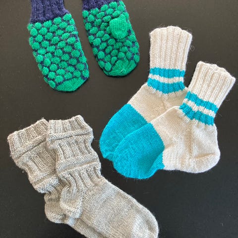 Seitsemän veljestä langasta kudottuja lasten sukkia.