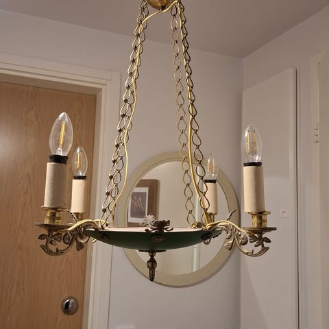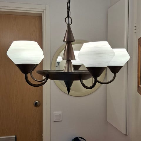 Vanha kattokruunu 3-haarainen. Messinkiä ja kuvut opaalilasia. Korkeus noin 80cm, halkaisija noin 35cm. Toimivuus testattu. E27 kannat. Pistotulppa asennettu.