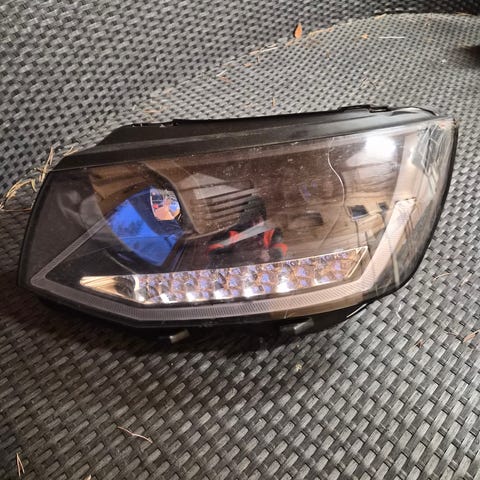 Volkswagen ajovaloumpiot ja etusäleikkö. Kuvissa näkyy yksi ajovaloumpio, jossa on integroidut päiväajovalot, sekä etusäleikkö punaisilla koristeraidoilla. Osat sopivat Volkswagen-henkilöautoon. Tarkempi yhteensopivuus, kuten korimalli ja vuosimalli, tulee varmistaa osanumeroiden tai omasta autosta löytyvien tietojen perusteella.