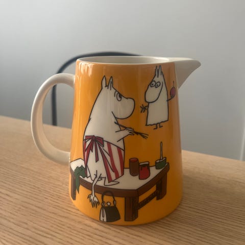 Virheettömät Muumimamman päivä kannu (2014-2015) ja mummimamma muki aprikoosi (2014-2020).