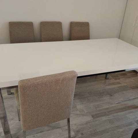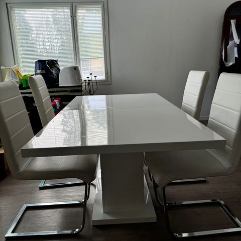 Lasipinnassa pieniä naarmuja, näyttää kuitenkin siistille, eikä häiritse. Tuolit hyvässä kunnossa. Ostettu uutena Marituulet liikkeestä Iisalmessa 2022.