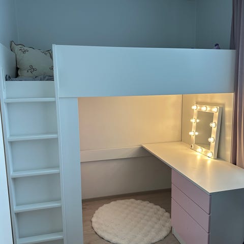 IKEA parvisänky lapselle. Runkomateriaali puu, sävy vaalea puu. Sängyssä on turvakaiteet reunoilla sekä kiinteä tikas nousua varten. Sängyn alla on avointa tilaa, jota voi käyttää esimerkiksi leikkitilana tai säilytykseen. Mukaan myös pään puolelle sijoitettava kupu kts viiminen kuva! Sängyn saa myös käännettyä matalaksi. HUOM. Patja ei tule mukaan