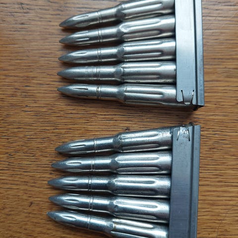 Kolmetoista kappaletta erilaisilla leimoilla olevia Mosin Naganin patruunasiteitä.