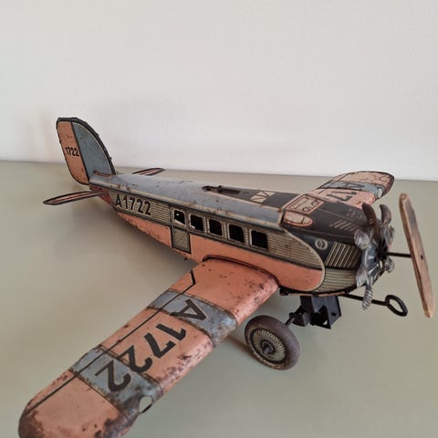 Vanha peltilentokone F-252 jonka on valmistanut ranskalainen Jep. Pituus 29 cm ja siipien väli 40 cm. Vedettävä ja toimii. Propelli ja takapyörä puuttuvat. Runsaasti ajanpatinaa näkyvissä. Nouto.