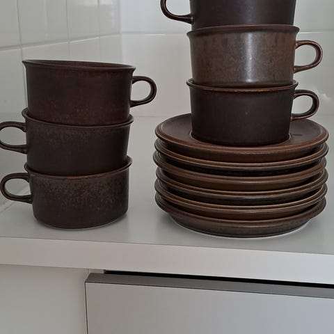Arabia Ruska- sarjan kermakko ja sokerikko. Astiasarja sisältää virheettömät kannellisen sokerikon ja kaatonokallisen kermakon. Lisäksi 6 kpl teekuppeja aluslautasineen. Kaikki yhteishintaan 75€