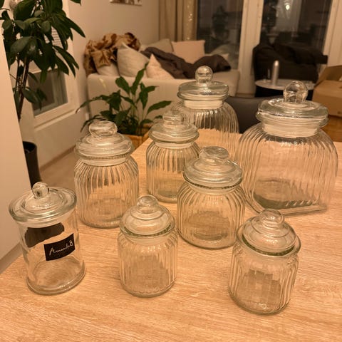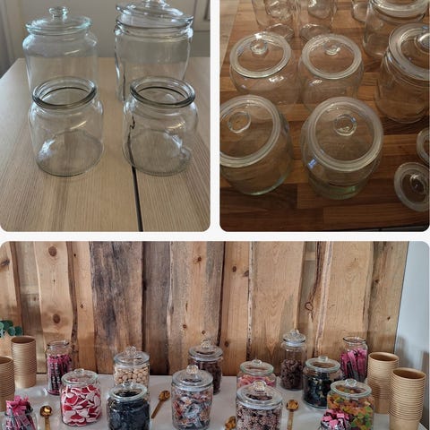 6 kpl lasisia säilytyspurkkeja kannella ja mustat metallikauhat. Käytetty häissä karkkibuffan tarjoiluun, kaikki pesty käytön jälkeen.