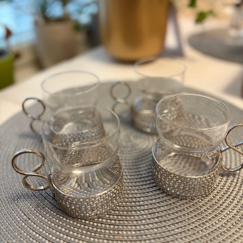 Iittala lasiset teekupit metallipidikkeillä. Kupit ovat kirkasta lasia ja niissä on irrotettavat, kuvioidut metallipidikkeet sormikahvoilla. Sopivat esimerkiksi teen tai muiden kuumien juomien tarjoiluun. Myydään kuvissa näkyvänä settinä.