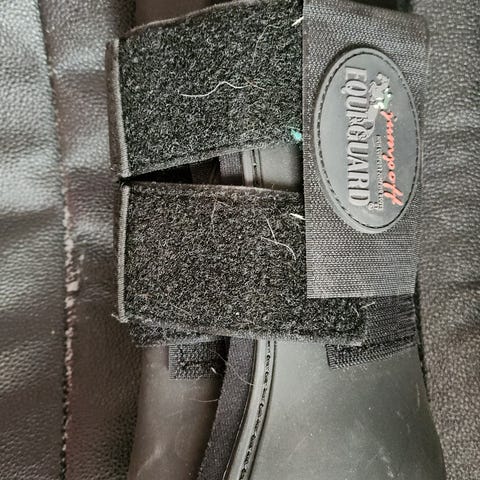 Cavalliero jännesuojat hevoselle, koko XL. Ulkopinta kullanvärisen sävyistä materiaalia, reunalla pehmeä valkoinen tekoturkisvuori. Kiinnitys usealla mustalla tarranauhalla. Suunniteltu suojaamaan hevosen jänteitä ja jalkoja ratsastuksessa ja liikutuksessa.