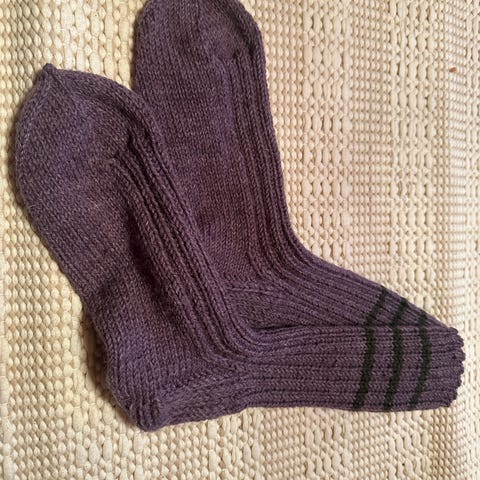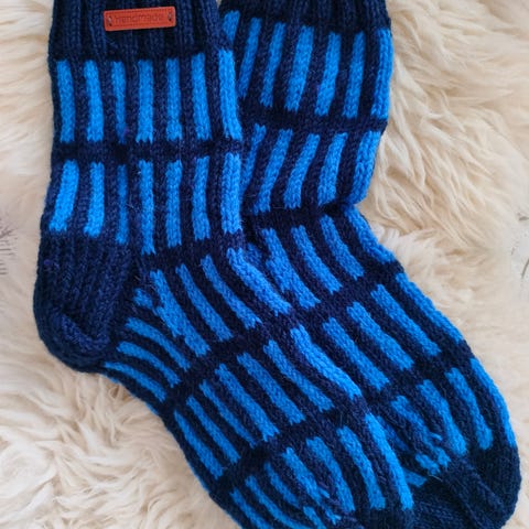 7 velj.-langasta neulotut uudet villasukat sini-harmaat, vahvistettu kantapää, jalan pit. 26cm, koko 40-42. Hinta 25€.