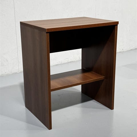 Kaksijalkainen musta sivupöytä, jossa on pyöreä kansi ja puolipyöreä taustalevy. Pöydän saa tuettua seinää vasten ka ruuveilla seinään. Pöydän korkeus on noin 80 cm, taso 72cmja halkaisija noin 55 cm.