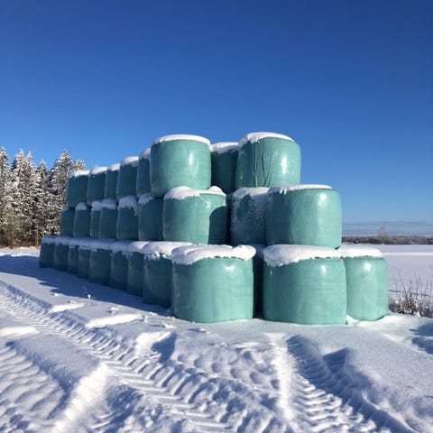 Odelma-heinää n. 300kg/paali. 12-kerrosta muovia. Säilötty propionihapolla.