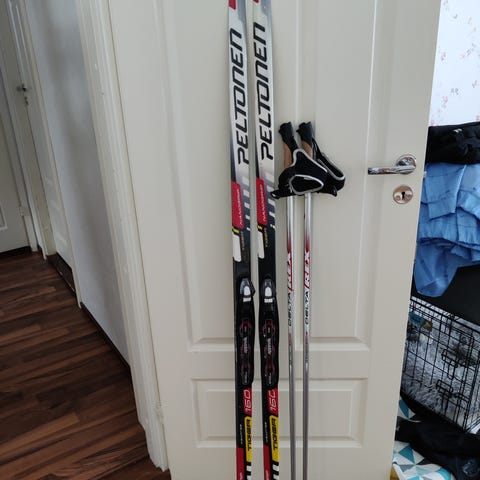 Ei uusinta mallia :) mutta toimivat välineet vapaan hiihtoon.