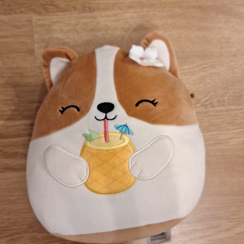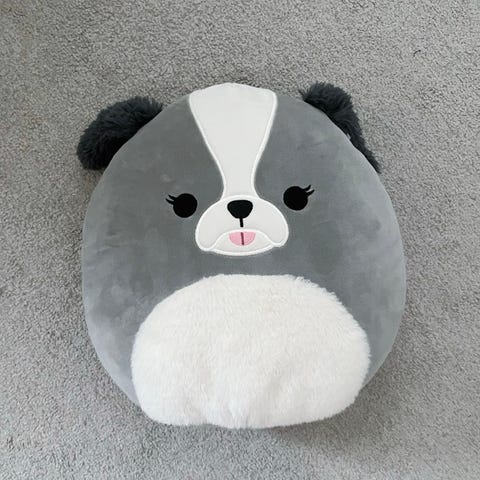 Squishmallows pehmolelu koira, väriltään beige ja valkoinen.
