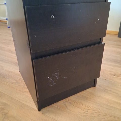Tuusulan Nummenharjusta haettavissa ikean lastulevyinen lipasto. (Yksi jalka irtosi siirrettäessä, on laittettavissa takaisin).