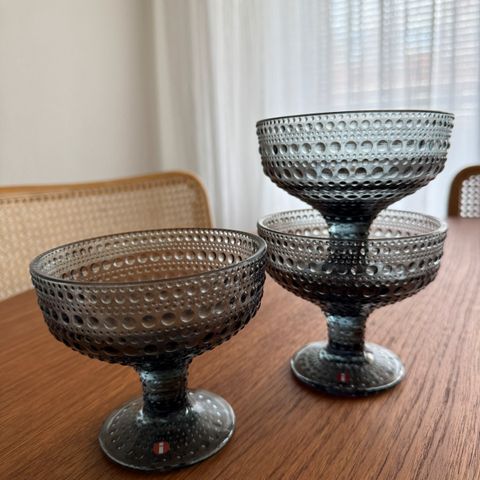 Iittala Kastehelmi jälkiruoka-kulhot värissä vaaleanharmaa (vanhempi myynnistä poistunut väri). Hyvässä kunnossa, ei käytönjälkiä tai naarmuja.