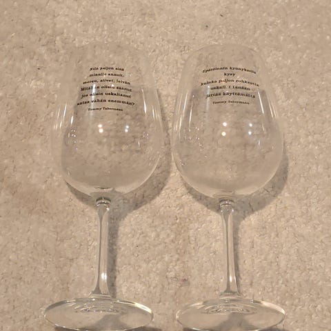 Viinilasit sijaitsevat Kruununhaka/Helsinki. Mieluiten nouto. Kotiinkuljetus pientä korvausta vastaan keskustan alueella. Lisää kuvia laseista kiinnostuneille.