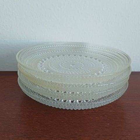 Iittala Kastehelmi vaaleanharmaat leipälautaset, halkaisija 17 cm. Ovat olleet jonkin verran käytössä, mutta en löytänyt näkyviä käytönjälkiä tai naarmuja. Ehjät ja erittäin siistit kaikin puolin.